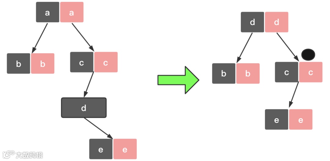 如果节点 d 是黑色,为了不违反红黑树路径相同原则,给节点 d 的右子节点 c 多加一个黑色,这个时候节点 c 就成了
