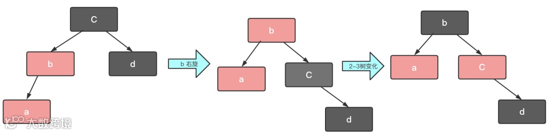 情况3:如果关注节点是 a,它的叔叔节点 d 是黑色,关注节点 a 是其父节点 b 的左子节点,我们就依次执行下面的操作: