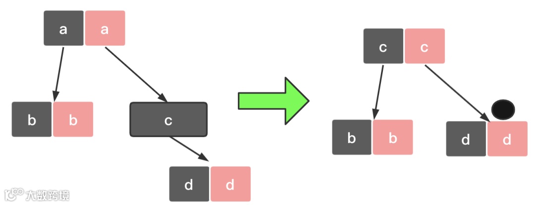 如果节点 c 是黑色,为了不违反红黑树的路径相同原则,给节点 c 的右子节点 d 多加一个黑色圆圈,这个时候节点 d 就成了