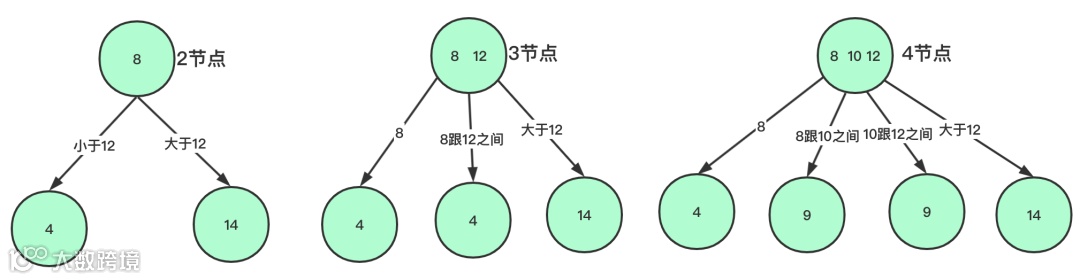 2结点:含有一个键和两条链接,左链接指向的2-3树中的键都小于该结点,右链接指向的2-3树中的键都大于该结点。3结点:含有两个键和三条链接,左链接指向的2-3树中的键都小于该结点,中链接指向的2-3树中的键都位于该结点的两个键之间,右链接指向的2-3树中的键都大于该结点。4节点:含有三个键和四条链接,大致的思路跟3节点类似。需注意在2-3树中,4节点是短暂存在的,会被转化为2节点或3节点。