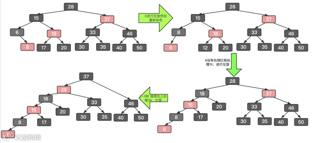 删除后就涉及到数据平衡修复了,还是根据2-3树来修复平衡,路上可能会碰到红色右倾节点,遇到就进行一次左旋即可。