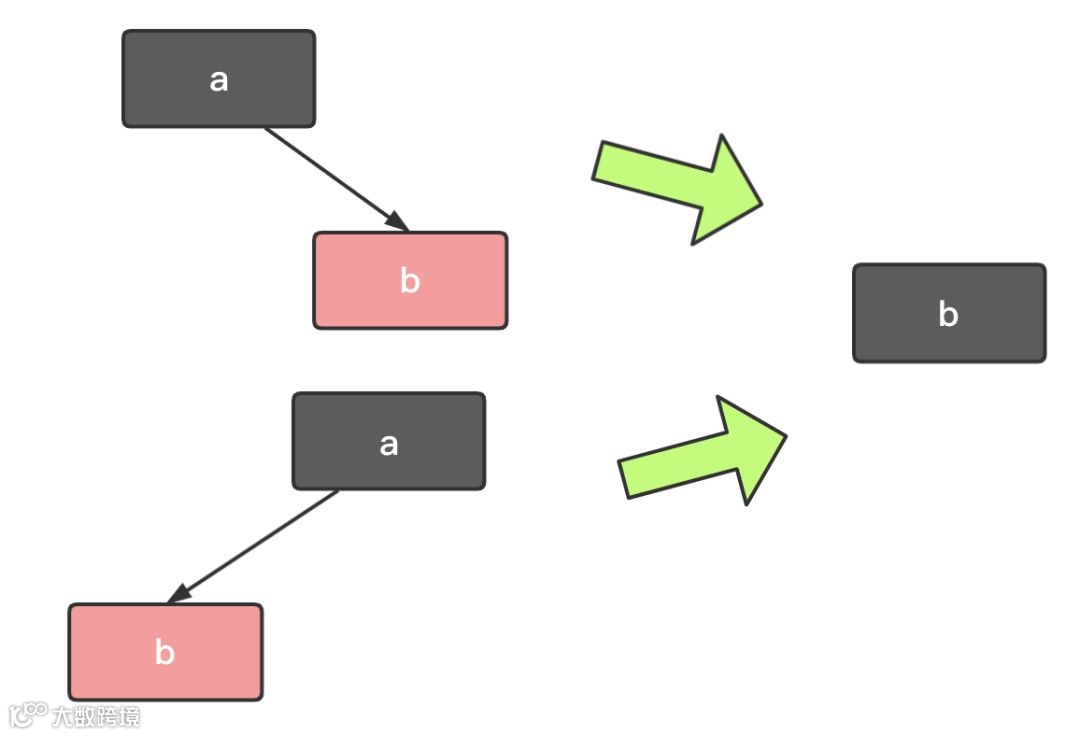 节点 a 只能是黑色,节点 b 也只能是红色,其他情况均不符合红黑树的定义。此时把节点 b 改为黑色。调整结束,不需要进行二次调整。