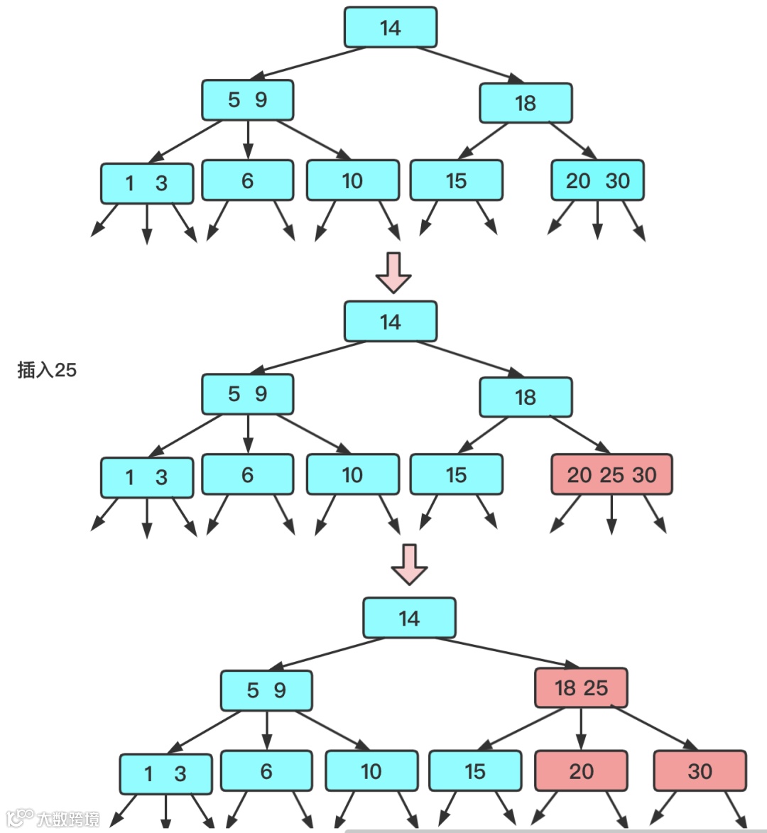 插入25 向一个父结点为3结点的3结点中插入新键4:跟上面套路类似,不断将中位数的数据往上提,直到遇到个2节点,或者到达了根节点然后进行拆分。