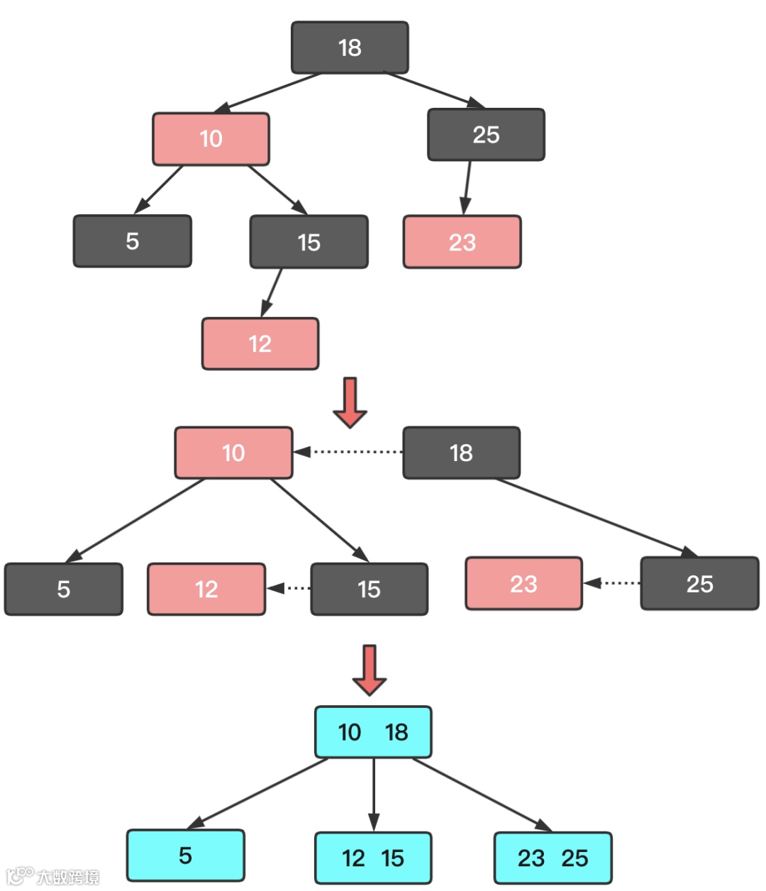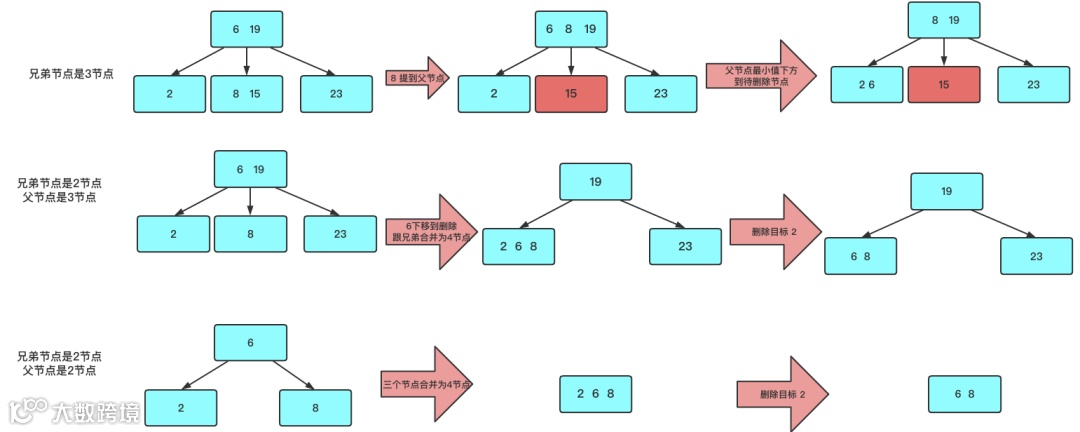 想办法让这个被删除的元素不可能出现在2节点中。如果发现删除元素树2节点则会从兄弟节点或父节点借个元素,当前2节点变为3节点或临时4节点,然后再删除目标数据。