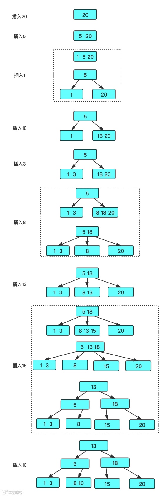 先找插入结点,若结点是2结点,则直接插入。如结点3结点,则插入使其临时容纳这个元素,然后分裂此结点,把中间元素移到其父结点中。对父结点亦如此处理。(中键一直往上移,直到找到空位,在此过程中没有空位就先搞个临时的,再分裂。)