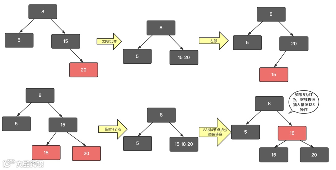整体来说左倾红黑树的插入就是这3种情况来回切换,最终达到平衡。