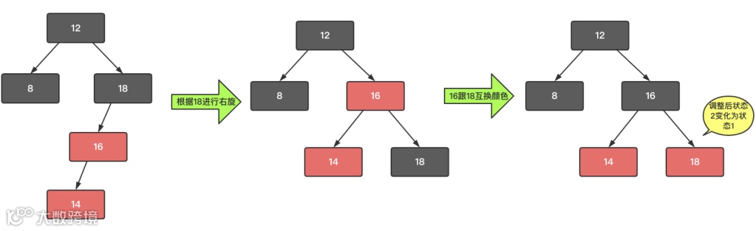 红 - 黑或者黑 - 黑。此时关注节点变成了节点 c,第二步的调整操作就会针对关注节点来做。