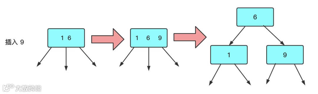 只有一个3结点的树,向其插入一个新数据:此时我们可以创建个临时4节点,然后将其转化为由3个2节点组成的2-3树