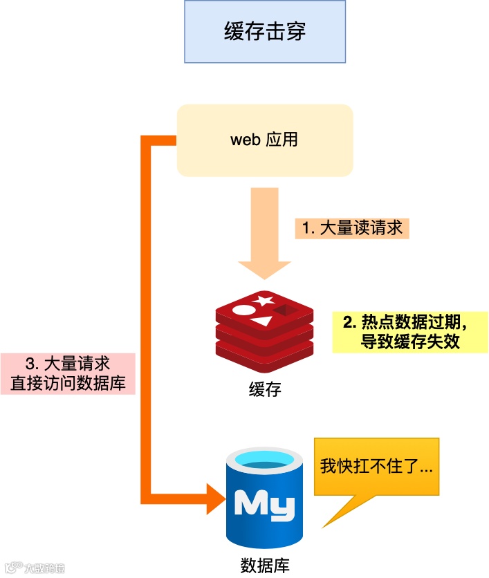 如果缓存中的某个热点数据过期了,此时大量的请求访问了该热点数据,就无法从缓存中读取,直接访问数据库,数据库很容易就被高并发的请求冲垮,这就是缓存击穿的问题。