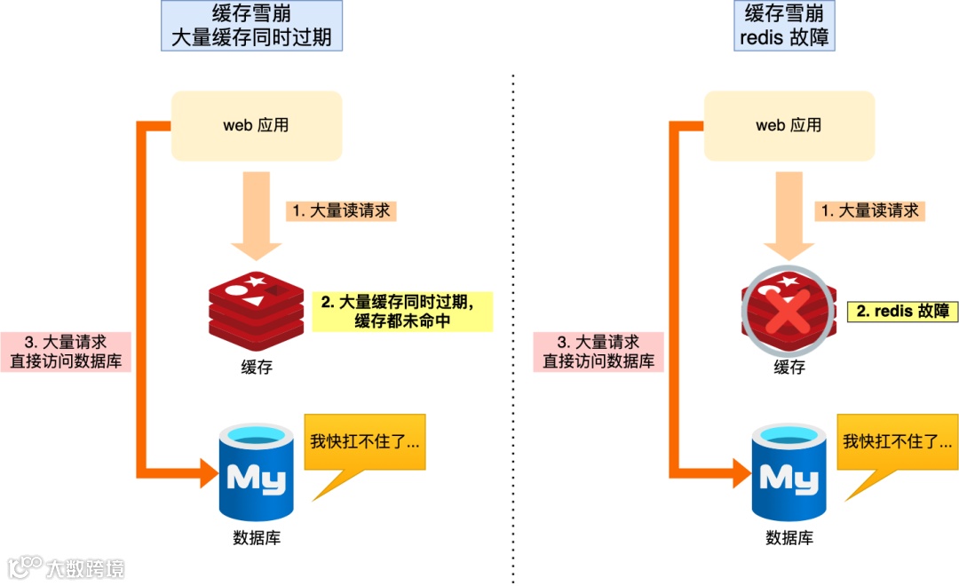 可以看到,发生缓存雪崩有两个原因: