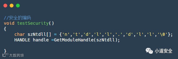 下图可以很清晰的看懂字符串信息”ntdll.dll”,这样就把代码的字符串信息直接暴露给大家,这样大家就可以通过字符串信息做一些对代码不安全的事情了。