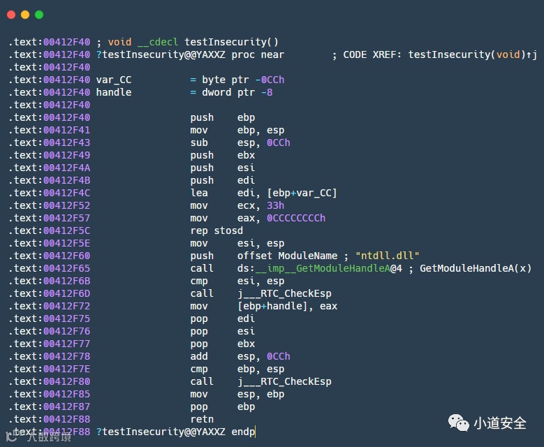 下图是自定义实现函数调用的汇编代码,可以从下面汇编代码看到关键函数是自己实现的,那么要了解该函数功能就需要进入到函数内部去做分析。这从而加强了关键函数功能的相对安全。