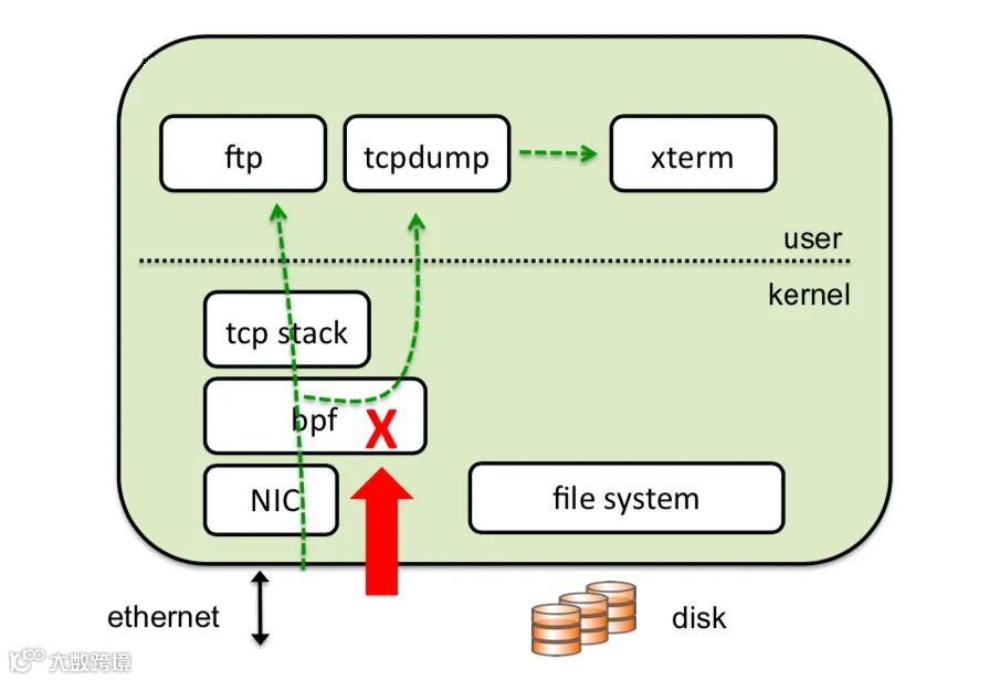 数据包过滤器(BPF)主要作用,就是根据用户输入的过滤规则,只将用户关心的数据包拷贝至 tcpdump,这样能够减少不必要的数据包拷贝,降低抓包带来的性能损耗。