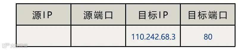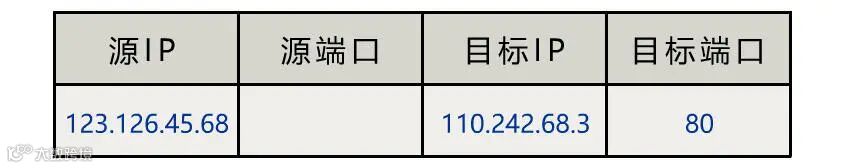 我一看这个表,这不就是经典的 socket 四元组嘛。我只有一块网卡,其 IP 地址是 123.126.45.68,我想要与 110.242.68.3 的 80 端口建立一个 TCP 连接,我将这些信息填写在了表中。