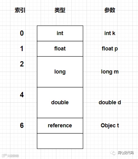 参数的存放总是在局部变量数组的索引0开始,到数组长度减1的索引结束,它最基本的存储单元就是Slot(变量槽)。当一个实例方法被调用的时候,它的方法参数和方法体内部定义的局部变量将会按照顺序被复制到局部变量表中的每一个Slot上。JVM会为局部变量表中的每个Slot都分配一个访问索引,通过这个索引即可成功访问到局部变量表中指定的局部变量值。其中32位以内的类型只占用一个slot(包含returnAddress类型,byte、short、char、float都转化为int类型,而boolean类型是0为false,非0为true),64位的类型(long和double)占用两个slot。如果需要访问局部变量表中一个64bit的局部变量值时,只需要使用前一个索引即可。