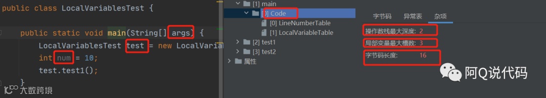 局部变量表也被称之为局部变量数组或本地变量表,实际上是一个“数字”数组,主要用于存储方法的参数和定义在方法体内的局部变量(包括各类基本数据类型、对象引用、returnAddress类型),虚拟机使用局部变量表完成方法返回。因为局部变量表是建立在线程的虚拟机栈上,是线程的私有数据,所以不会存在数据安全问题。另外栈帧的大小主要受局部变量表的影响,而局部变量表所需的容量大小是在编译期确定下来的,并保存在方法的Code属性的maxmum_local_variables数据项中,所以在方法运行期间是不会改变局部变量表的大小的,因此一个栈帧需要分配多少内存,不会受到程序运行期变量数据的影响,而仅仅取决于具体的虚拟机实现。一般来说在,在虚拟机栈大小固定的前提下,它的局部变量表越大,它的栈帧就越大,那它的嵌套调用次数(方法调用数)也就越少,即栈的深度越浅。用几张字节码的图来说明一下局部变量表中的内容: