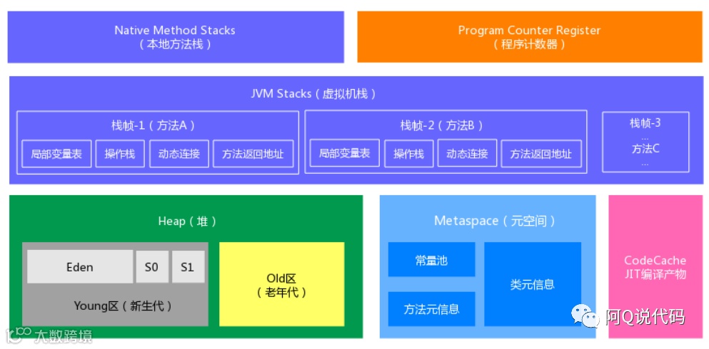 图中的CodeCache在JVM官方文档中被归于元空间,而在阿里的官方文档中被单独摘了出来,此处区别并不影响我们对它的学习。