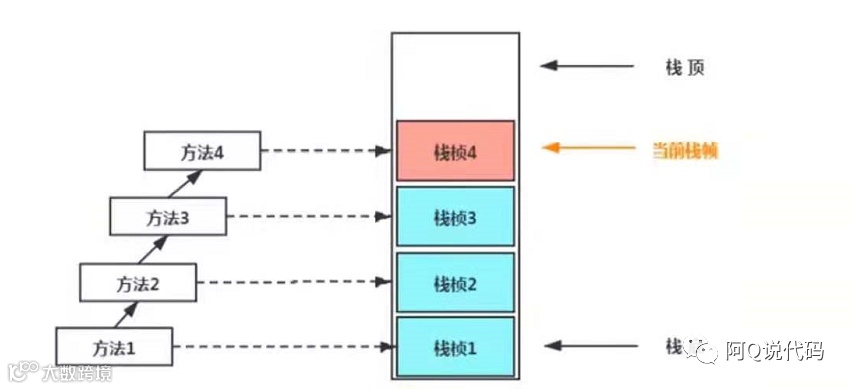 程序开始执行,首先方法1入栈,为栈帧1,此时栈帧1为当前栈帧;随后方法1调用方法2,方法2入栈,为栈帧2,此时栈帧2为当前栈帧,以此类推;当方法4入栈成为栈帧4并且执行代码,在方法4返回之际,栈帧4会传回方法4的执行结果给栈帧3,接着,虚拟机会丢弃栈帧4即栈帧4出栈,使得栈帧3重新成为当前栈帧,以此类推,直到方法1执行完成,栈帧1出栈,虚拟机栈被回收。