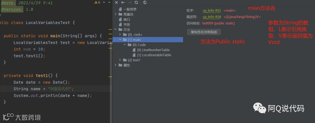如果当前帧是由构造方法或者实例方法创建的,那么该对象的引用this将会存放在index为0的slot处,其余的参数按照参数表顺序继续排列,而this变量不存在于静态方法的局部变量表中,所以上文中的main方法中不存在this变量。