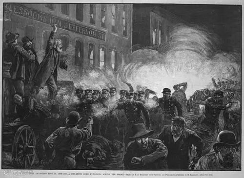 1886年5月1日,美国2万多个企业的35万工人罢工,各种肤色工种的工人游行示威,声势浩大,迫使资本家实行八小时工作制。游行遭到政府暴力镇压,当场开枪打死六人,八名工人领袖被判刑。