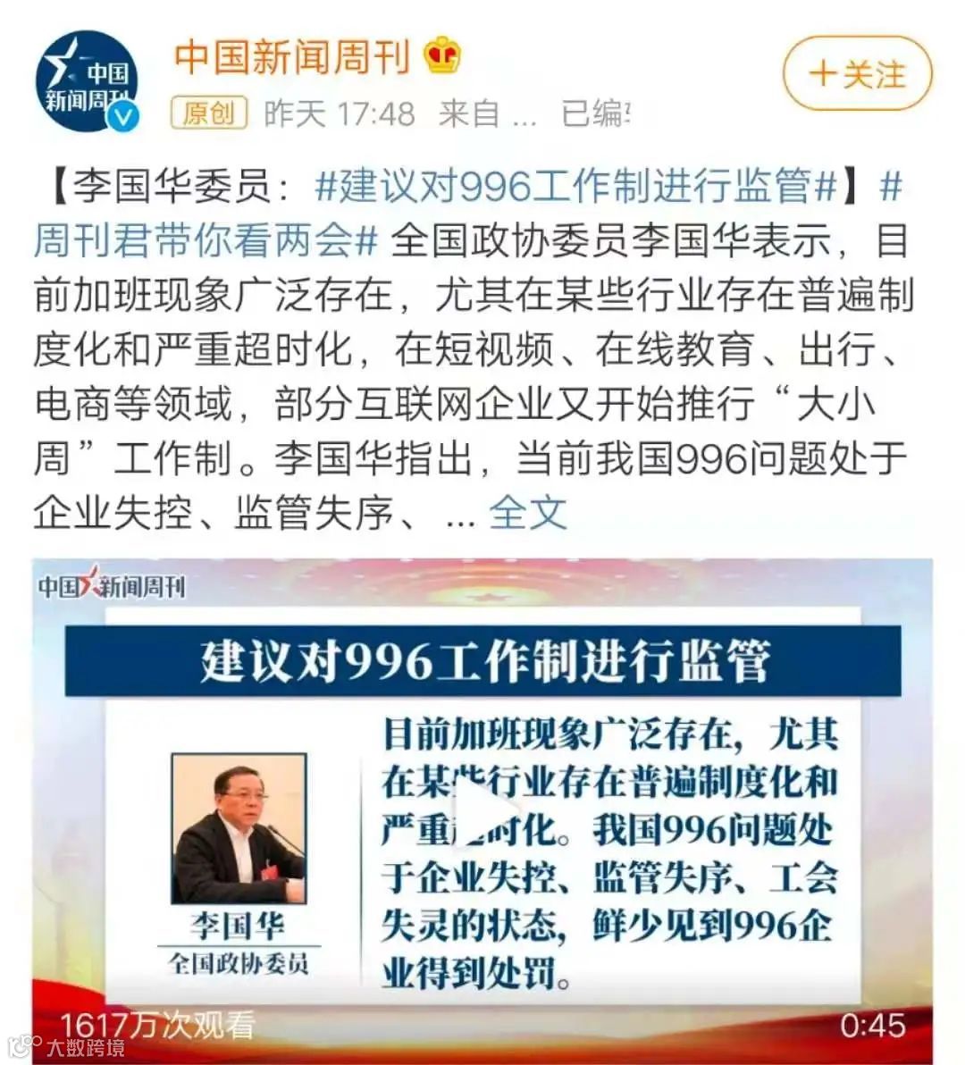 2021年3月9日李国华建议对996工作制进行监管。996也许对国家经济发展有利,是福报,但对个人来说身体健康陪伴家人也很重要。