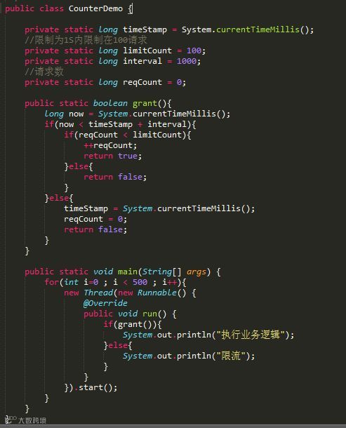 计数器是一种比较简单的限流算法,用途比较广泛,在接口层面,很多地方使用这种方式限流。在一段时间内,进行计数,与阀值进行比较,到了时间临界点,将计数器清0。