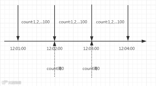 这里需要注意的是,存在一个时间临界点的问题。举个栗子,在12:01:00到12:01:58这段时间内没有用户请求,然后在12:01:59这一瞬时发出100个请求,OK,然后在12:02:00这一瞬时又发出了100个请求。这里你应该能感受到,在这个临界点可能会承受恶意用户的大量请求,甚至超出系统预期的承受。