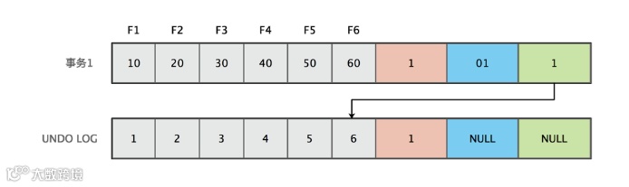假设 F1~F6 是表中字段的名字,1~6 是其对应的数据。后面三个隐含字段分别对应该行的隐含ID、事务号和回滚指针,如下图所示。