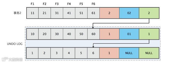接下来,与事务 1 相同,此时 Undo log 中有两行记录,并且通过回滚指针连在一起。因此,如果 Undo log 一直不删除,则会通过当前记录的回滚指针回溯到该行创建时的初始内容,所幸的是在 InnoDB 中存在 purge 线程,它会查询那些比现在最老的活动事务还早的 Undo log,并删除它们,从而保证 Undo log 文件不会无限增长,如下图所示。
