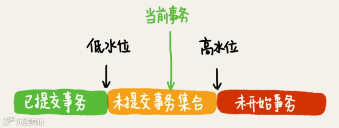 数组里面事务ID的最小值记为低水位,当前系统里面已经创建过的事务ID的最大值加1记为高水位。