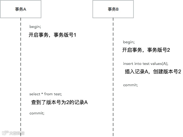 注意到了吧,事务A查询时,事务B还没提交呢!但它生成的(1,3)版本已成当前版本。但这版本对事务A必须是不可见的,否则就是脏读啦.