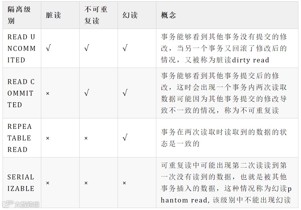读未提交(READ UNCOMMITED)->读已提交(READ COMMITTED)->可重复读(REPEATABLE READ)->序列化(SERIALIZABLE)。隔离级别依次增强,但是导致的问题是并发能力的减弱。