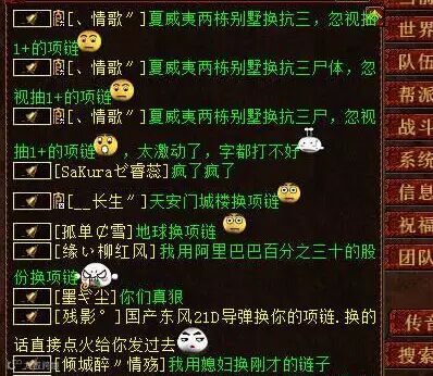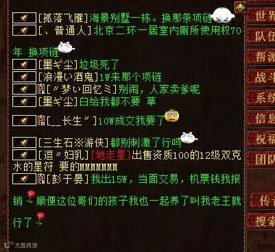 一玩家在世界频道叫卖项链,2000RMB的高价卖一条蓝字忽视抽的链子,结果被一众围观群众给玩坏了...用媳妇交换也是醉了.....