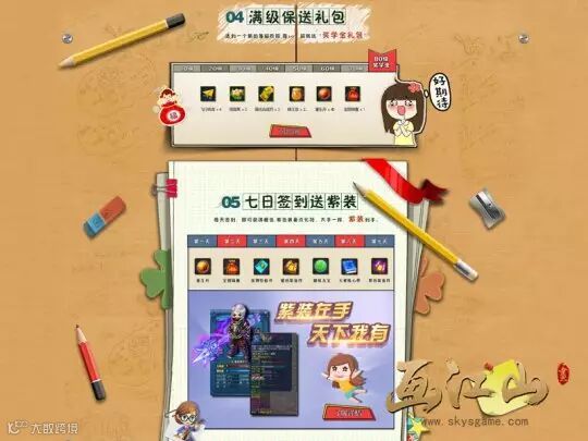 每提高10级就有奖学金奖励哦~物品、道具、宝物,只有你想不到!开服当天开始保持连续签到,就可以天天领壕礼!橙装紫装助你勇闯画江山!