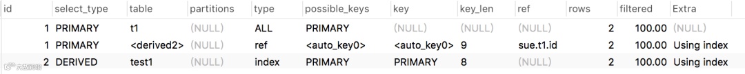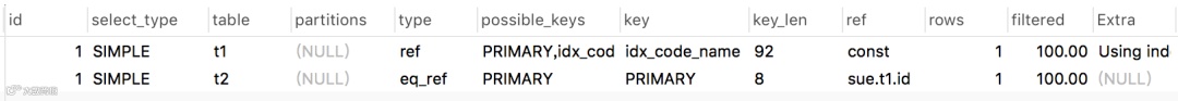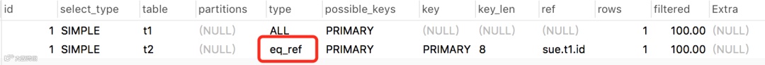 我们看到表t1命中的索引是const(常量),而t2命中的索引是列sue库的t1表的id字段。