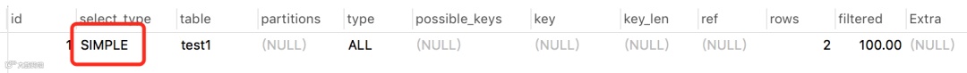 它只在简单SELECT查询中出现,不包含子查询和UNION,这种类型比较直观就不多说了。