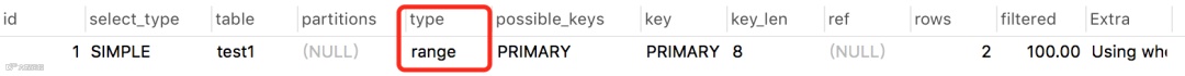 explain select * from test2 where id between 1 and 2;结果: