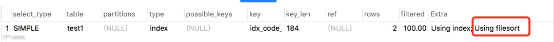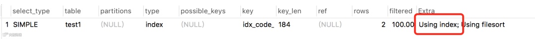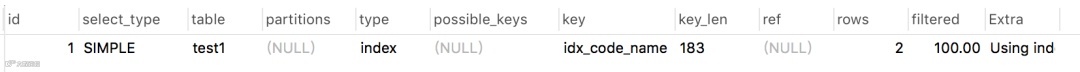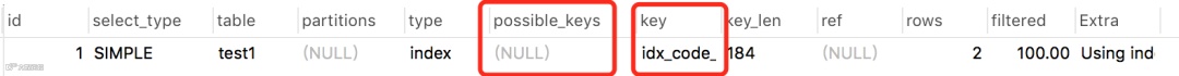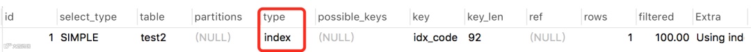 上面那个例子中其实就用到了:Using index,因为只返回一列code,它字段走了索引。