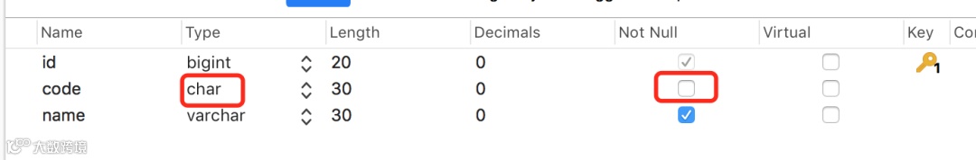 再把test1表的code字段类型改成char,并且改成允许为空: