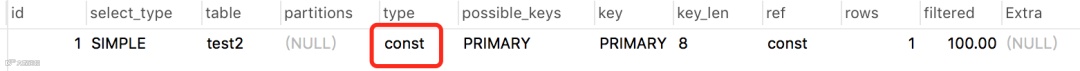 常用于主键或唯一索引扫描。执行sql如下: