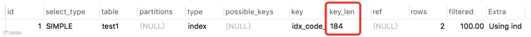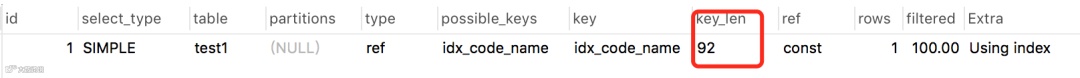 上图中使用了联合索引:idx_code_name,如果索引全匹配key_len应该是183,但实际上却是92,这就说明没有使用所有的索引,索引使用不充分。