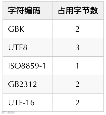 常用的字符编码占用字节数量如下: