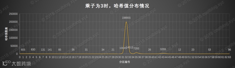 上面的图还是很一幕了然的,乘子2算出的哈希值几乎全部落在第32分区,也就是 [0, 67108864)数值区间内,落在其他区间内的哈希值数量几乎可以忽略不计。这也就不难解释为什么数字2作为乘子时,算出哈希值的冲突率如此之高的原因了。所以这样的哈希算法要它有何用啊,拖出去斩了吧。接下来看看数字3作为乘子时的表现: