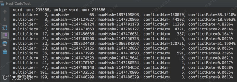 System.out.println(String.format("multiplier=%4d, minHash=%11d, maxHash=%10d, conflictNum=%6d, conflictRate=%.4f%%",