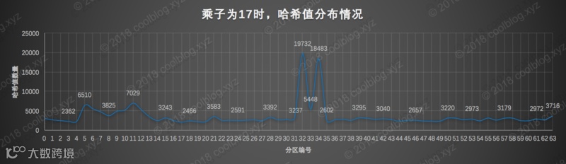 3作为乘子时,算出的哈希值分布情况和2很像,只不过稍微好了那么一点点。从图中可以看出绝大部分的哈希值最终都落在了第32分区里,哈希值的分布性很差。这个也没啥用,拖出去枪毙5分钟吧。在看看数字17的情况怎么样: