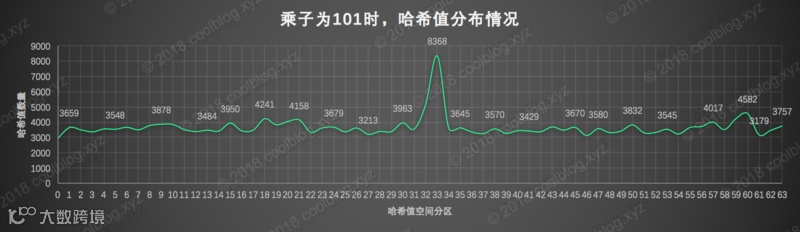 最后再来看看大质数101的表现,不难看出,质数101作为乘子时,算出的哈希值分布情况要好于主角31,有点喧宾夺主的意思。不过不可否认的是,质数101的作为乘子时,哈希值的分布性确实更加均匀。所以如果不在意质数101容易导致数据信息丢失问题,或许其是一个更好的选择。