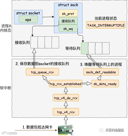 当软中断上收到数据包时会通过调用 sk_data_ready 函数指针(实际被设置成了 sock_def_readable()) 来唤醒在 sock 上等待的进程。这个咱们后面介绍软中断的时候再说,这里记住这个就行了。