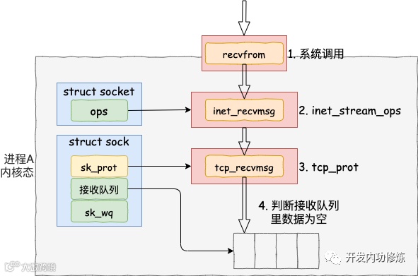 进入系统调用后,用户进程就进入到了内核态,通过执行一系列的内核协议层函数,然后到 socket 对象的接收队列中查看是否有数据,没有的话就把自己添加到 socket 对应的等待队列里。最后让出CPU,操作系统会选择下一个就绪状态的进程来执行。整个流程图如下:
