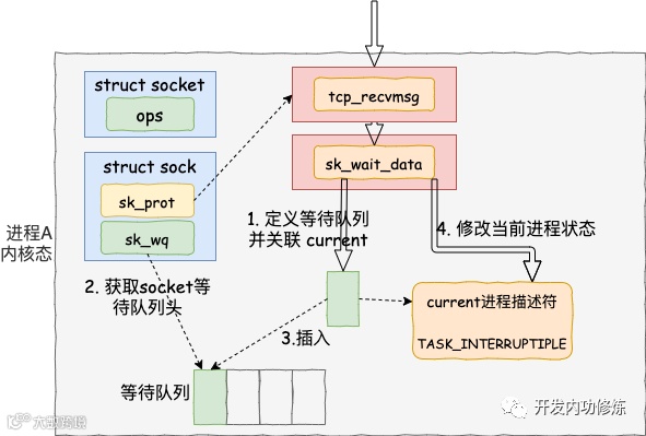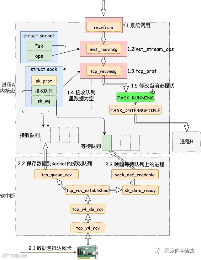 第一部分是我们自己代码所在的进程,我们调用的 socket() 函数会进入内核态创建必要内核对象。recv() 函数在进入内核态以后负责查看接收队列,以及在没有数据可处理的时候把当前进程阻塞掉,让出 CPU。 -