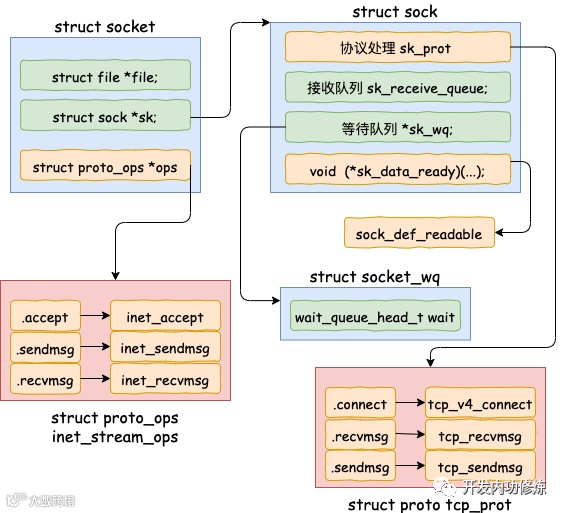 开篇源码中的 socket 函数调用执行完以后,内核在内部创建了一系列的 socket 相关的内核对象(是的,不是只有一个)。它们互相之间的关系如图。当然了,这个对象比图示的还要更复杂。我只在图中把和今天的主题相关的内容展现了出来。